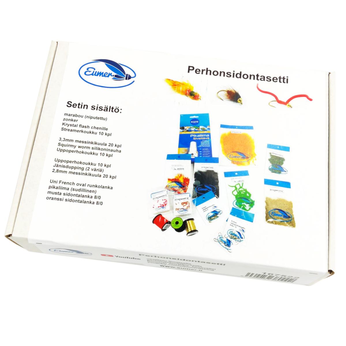 Helpoin tapa aloittaa perhonsidonta! Olemme rakentaneet sinulle materiaalilaatikon, missä on vain tarvittavat materiaalit huippuperhoihin, eikä yhtään turhaa ja ylimääräistä. Tämän setin lisäksi tarvitset vain perhonsidonta työkalut (myydään erikseen).