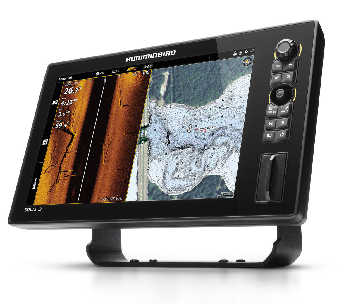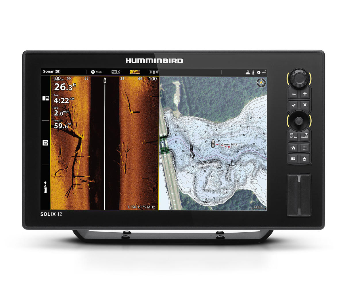 Humminbird SOLIX 12 Dual Core -prosessori, yksityiskohtaisen tarkka 12,1″-kosketusnäyttö 1500 NIT kirkkaudella, markkinoiden johtava MEGA Imaging + tekniikka yhdessä Dual Spectrum CHIRP -luotauksen kanssa.