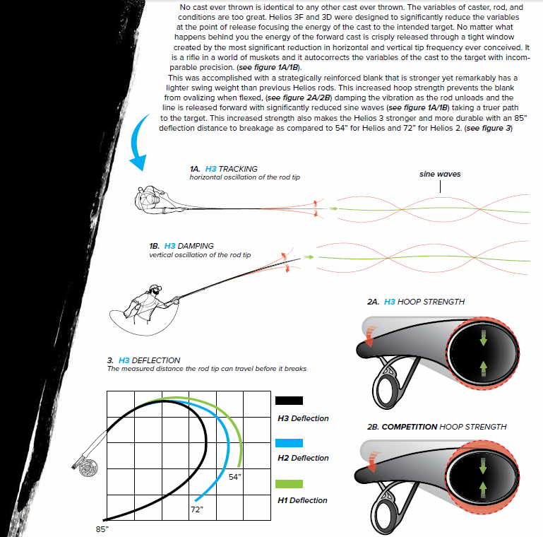 Helios 3 vavat tarjoavat edeltäjäänsä vieläkin parempaa tarkkuutta samalla ylläpitäen klassista tunnelmaa ja hienostuneisuutta. Tämä vapa on suunniteltu asettelemaan pinturi teekuppiin 15 metrin päästä. Helios 3F:n suunnittelun tarkoituksena oli merkittävästi pienentää eri muuttujia, jotka vaikuttavat negatiivisesti heitossa käytetyn energian siirtymistä itse heittoon. Helios 3F vähentää vavan kärjen ylimääräistä horisontaalista ja vertikaalista liikehdintää minimiin, täten parantaen niin heittopituuksia kuin eteenkin heittotarkkuutta. Sitä voisikin luonnehtia kivääriksi muskettien maailmassa. Tiivistetysti sanoen Helios 3F on ultimaattinen avoveden taimenvapa, joka tarjoaa kirurgin tarkkuuden tiukoissakin tilanteissa, höyhenen kevyen presentaation ja reaktion, jonka kalastaja tuntee luissa ja ytimissä.