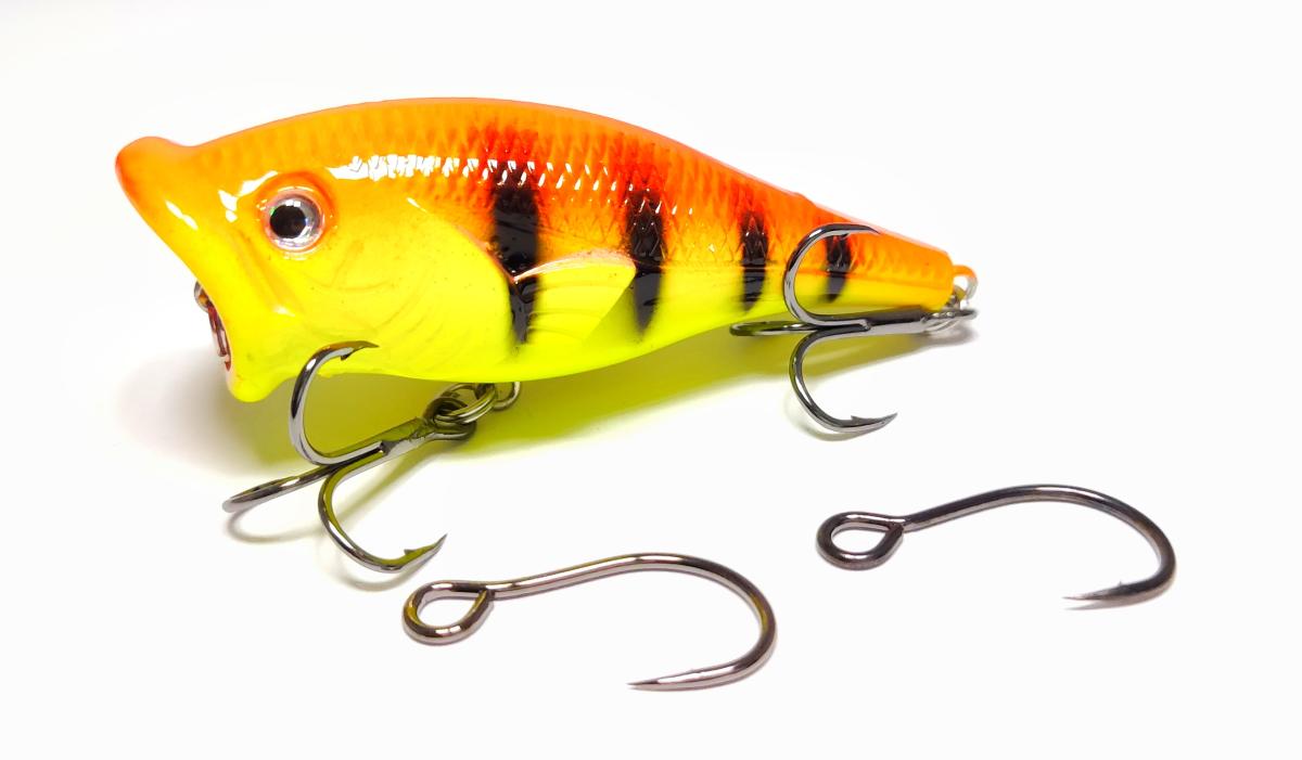 Pakkaus sisältää kolmihaarakoukkujen lisäksi 2 kpl yksihaaraisia koukkuja, joiden avulla Plopper Popperilla voidaan kalastaa vesikasvillisuuden seassa ilman, että koukut tarttuvat kiinni kasvillisuuteen.
