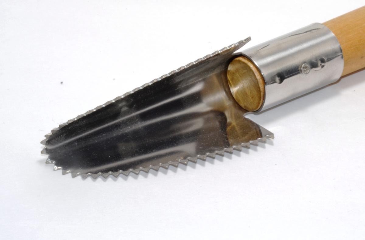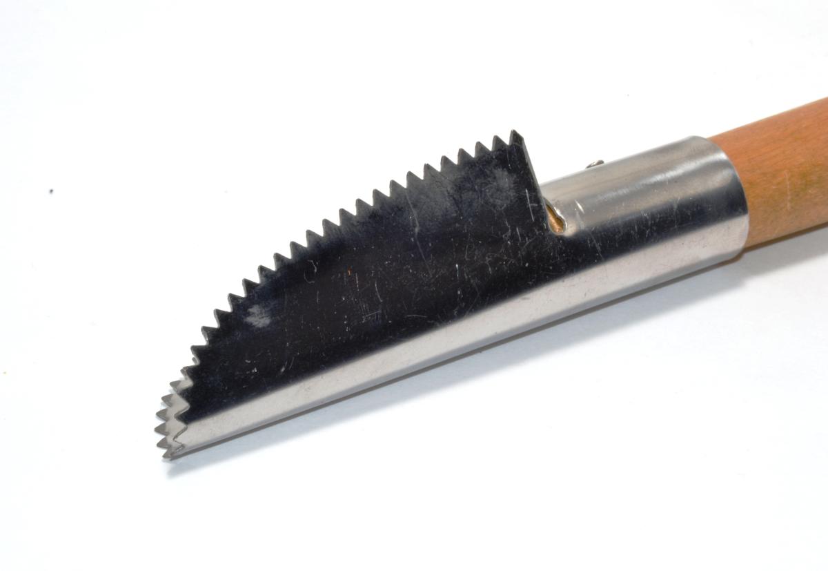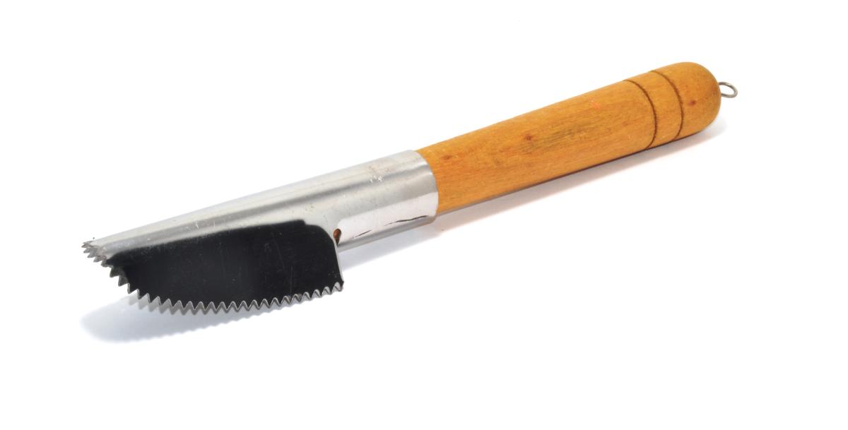 Ruostumattomasta teräksestä valmistettu suomustusrauta puukahvalla