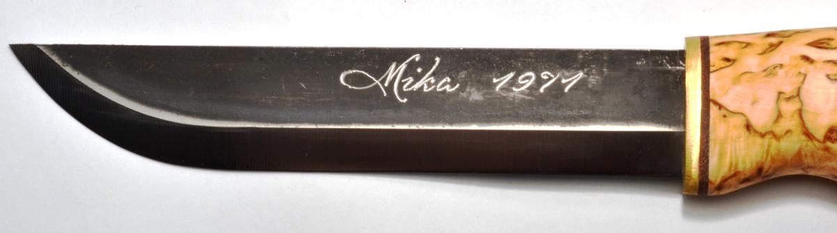 Puukkoon mahdollisus kaivertaa tyylikäs teksti kahvaan ja/tai terään!
