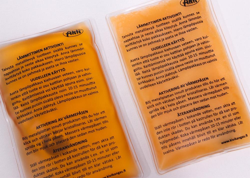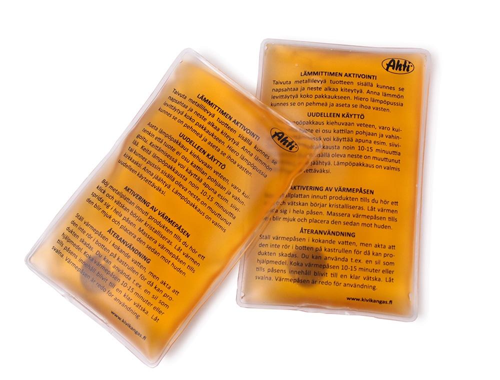 - Aktivointi: napsauta pakkauksen sisällä olevaa metallilevyä, jolloin sisällä oleva aine alkaa kiteytyä ja lämmetä. Anna lämmön levitä koko pakkaukseen ja laita lämmitettävään kohtaan esim. käsineen sisälle. Uudelleen käyttö: Aseta lämpöpakkaus kiehuvaan veteen ja keitä kunnes kirkastuu, n 15 min. Anna jäähtyä ja lämpöpussi on uudelleen käytettävissä.