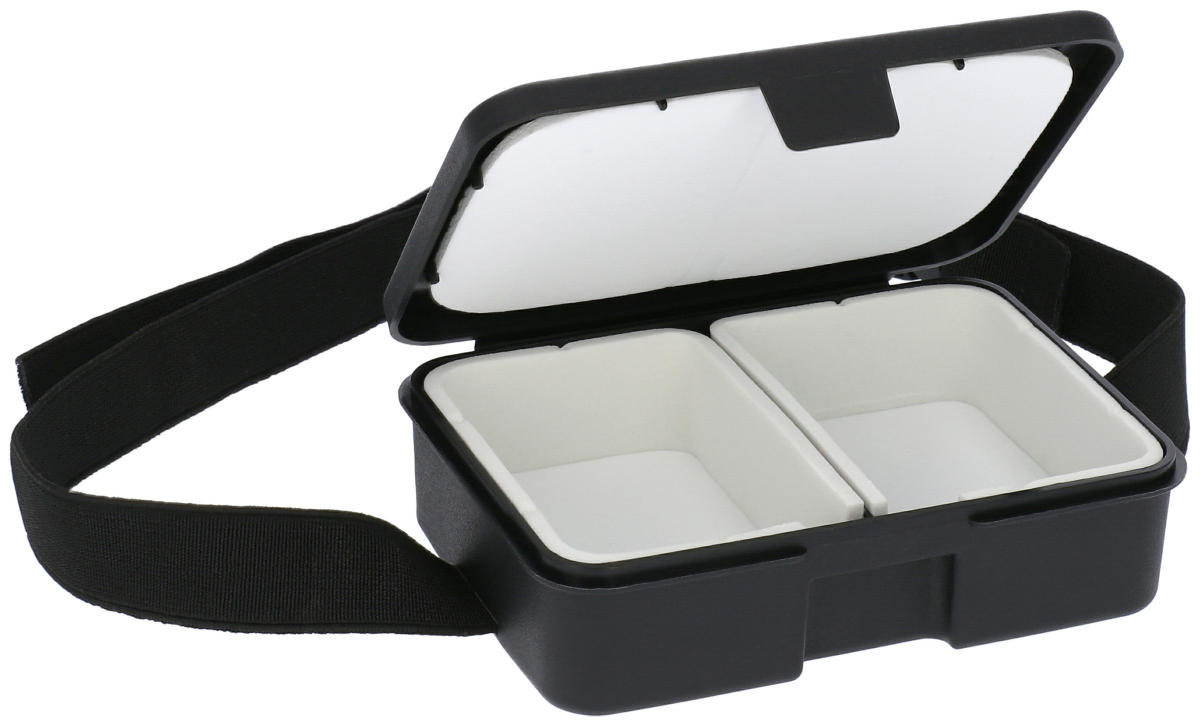 - Rasiassa mukana kestävä elastinen nauha, jonka avulla rasian voi kiinnittää kätevästi esimerkiksi reiden ympärille. Nauhassa säädettävä kiinnitys
